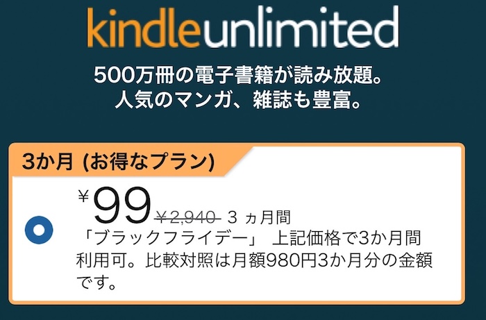 Kindle Unlimited 3か月99円 キャンペーン 2025年11月 ブラックフライデー