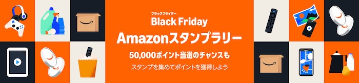 プライム会員限定のキャンペーンですが、ブラックフライデー中は5つの条件を満たすと最大5万ポイント当たるスタンプラリーも開催。