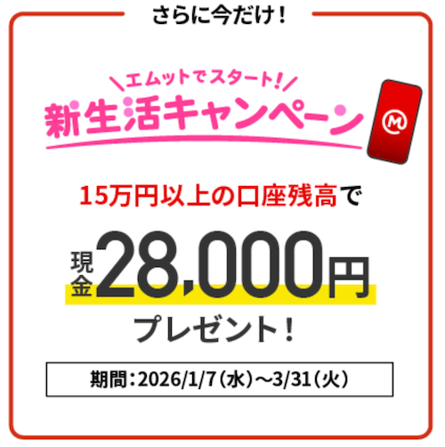 - 口座開設翌月末時点で残高15万円以上: 現金3万円