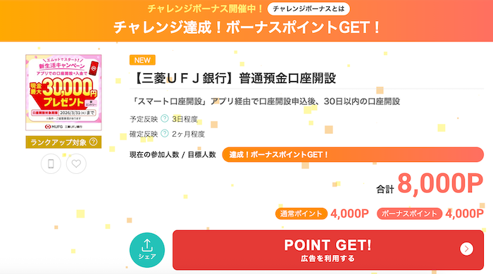 現在各種ポイントサイトで三菱UFJ銀行の口座開設で高ポイント還元が実施されています。