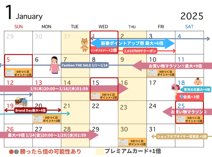 また、楽天イーグルスやヴィッセル神戸が勝利した翌日に開催される勝ったら倍キャンペーンは単体の場合+1倍、どちらも勝利が重なった日はW勝利+2倍となるので、5と0のつく日よりお得になります。カレンダーでは勝ったら倍が開催される可能性のある日にマークをつけています。
