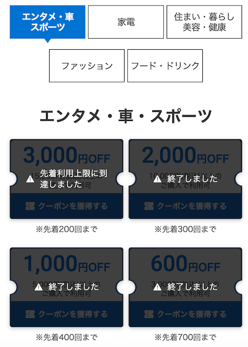 フード・ドリンクやファッションでも最大3,000円OFFクーポンが使えるようになったのはいい改良ですよね。