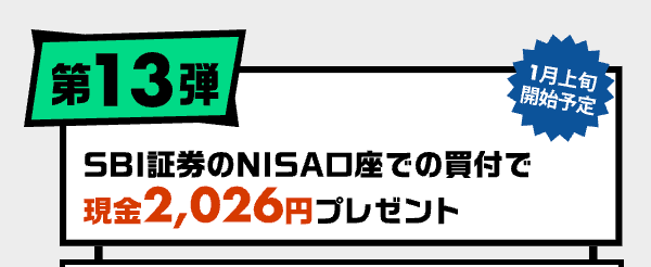 キャンペーン期間中にエントリーのうえ、残高判定日時点でSBIハイパー預金に10万円以上あり、かつSBI証券のNISA口座で、キャンペーン期間中に株式または投資信託を合計50万円以上買付すると、もれなく現金2,026円プレゼント!