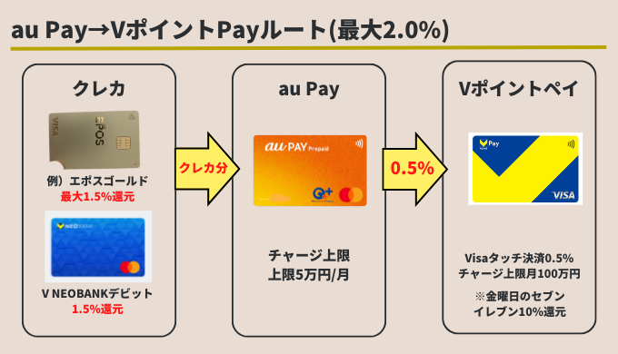 Visa割キャンペーンのメイン決済手段としておすすめのカードはVポイントペイです。VポイントペイはauPay経由のチャージで最大2.0%、Vポイントペイの利用で0.5%、計2.5%還元で利用できるプリペイド型決済アプリです。